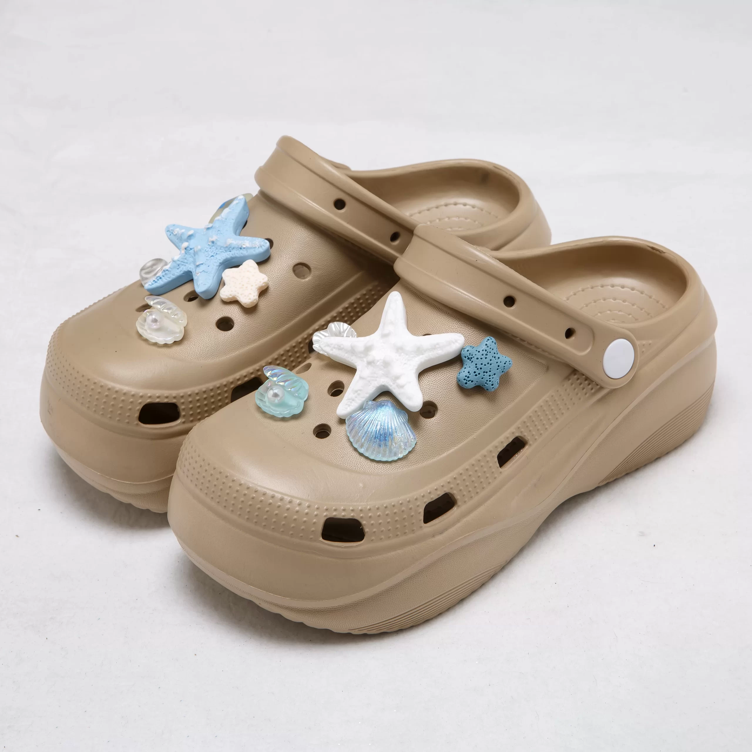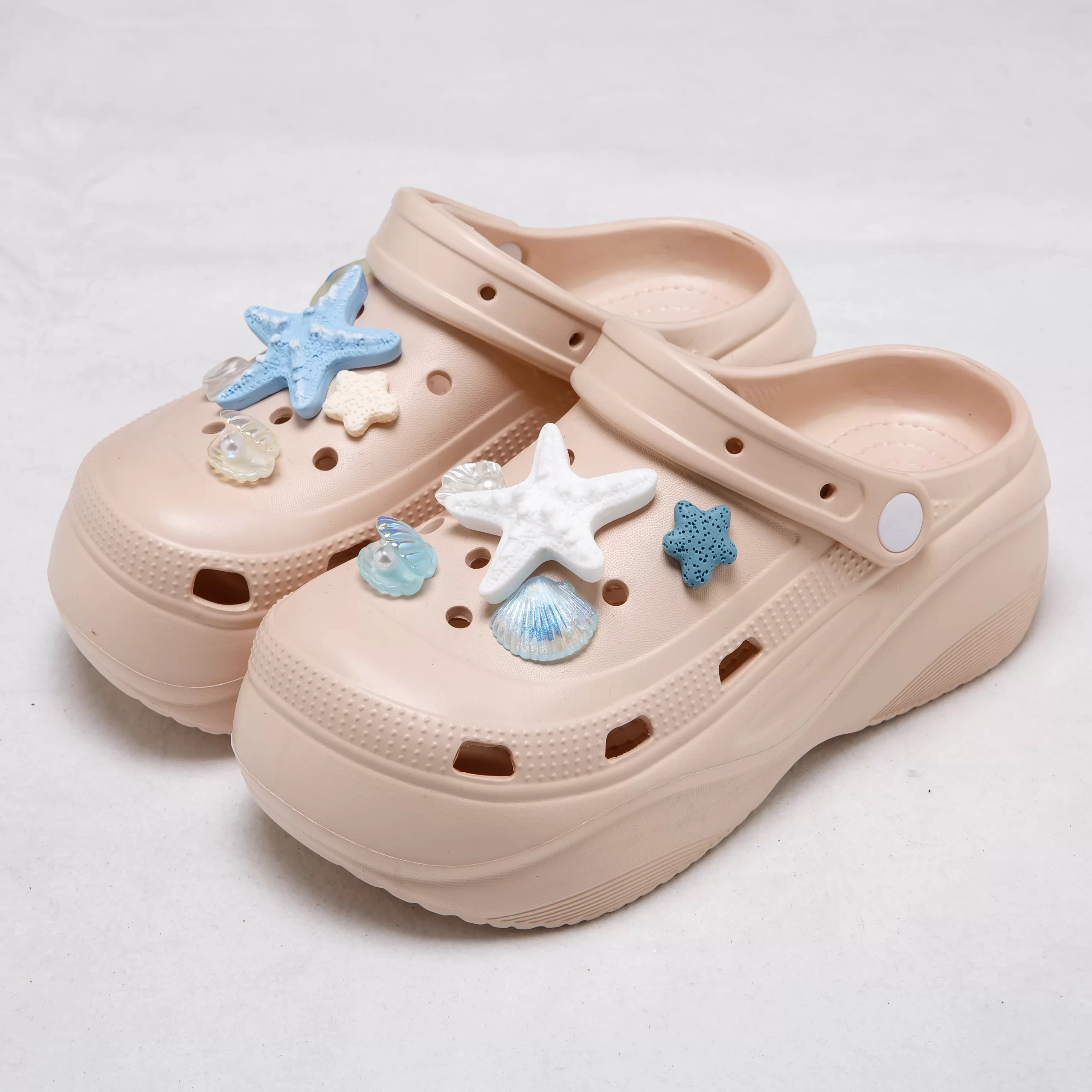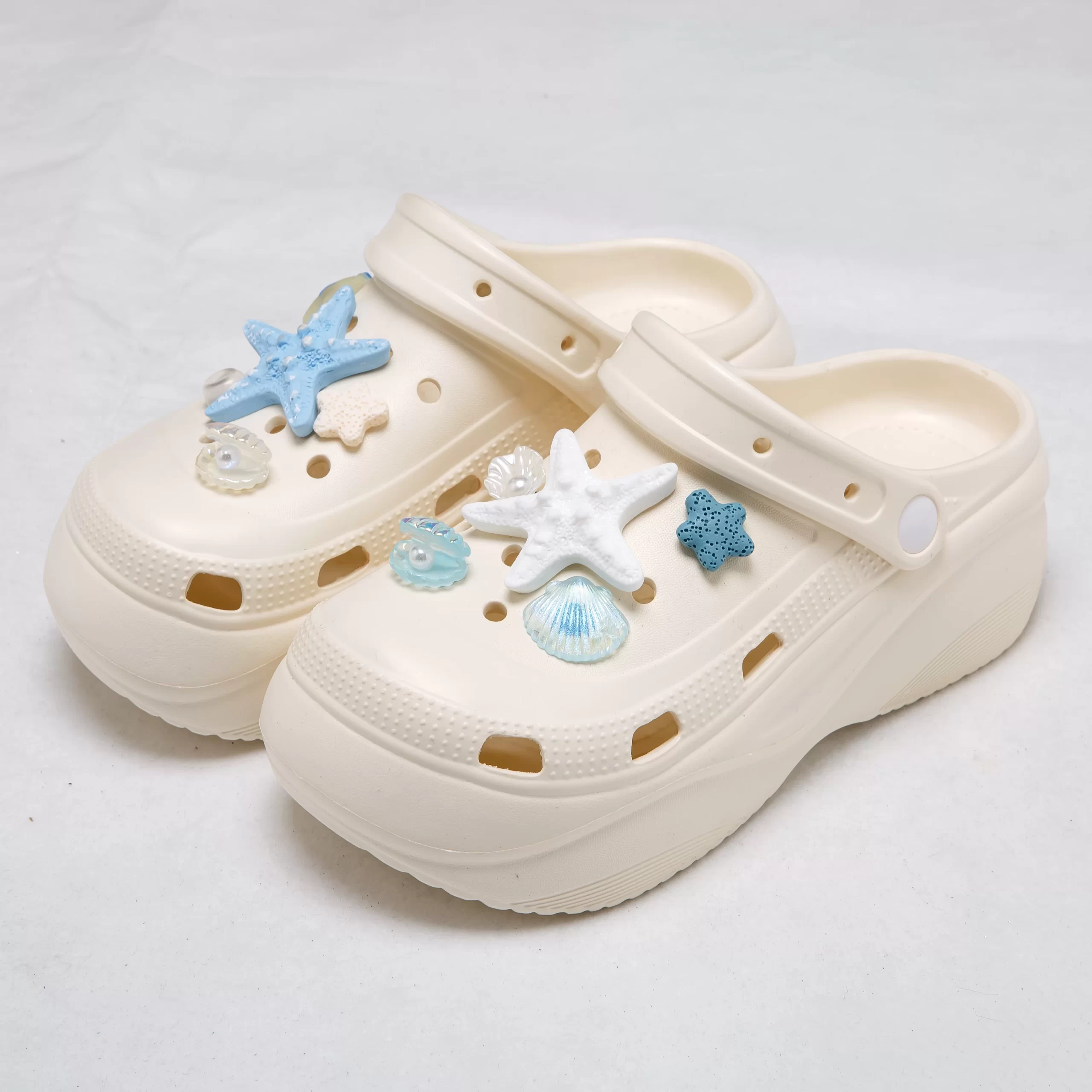 These dreamy platform clogs bring a coastal vibe to your summer look, featuring adorable ocean-inspired charms like starfish, seashells, and translucent beads that capture the light for a subtle shimmer. The chunky EVA sole provides a 5cm height boost, giving you a flattering lift while remaining lightweight and comfortable for all-day wear.