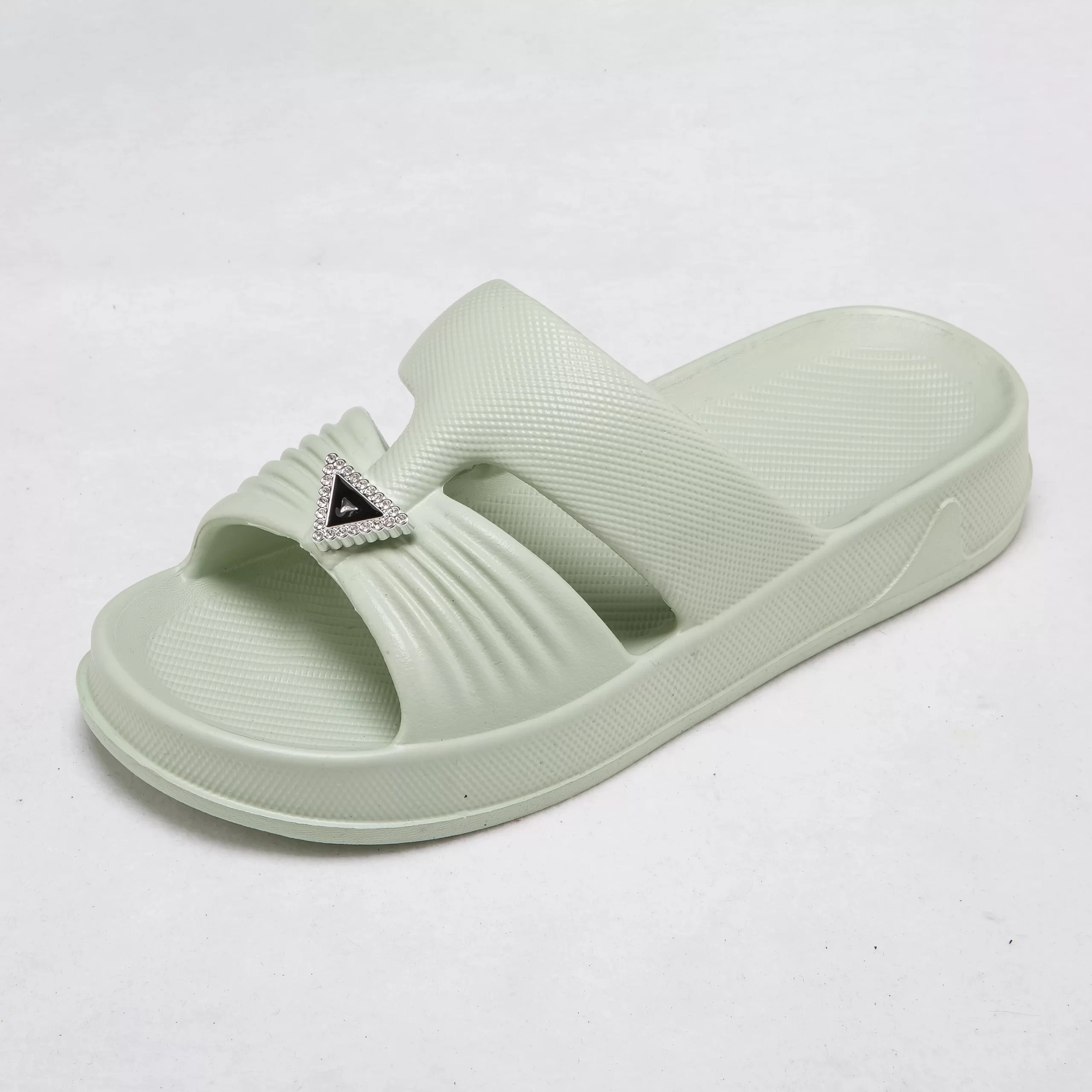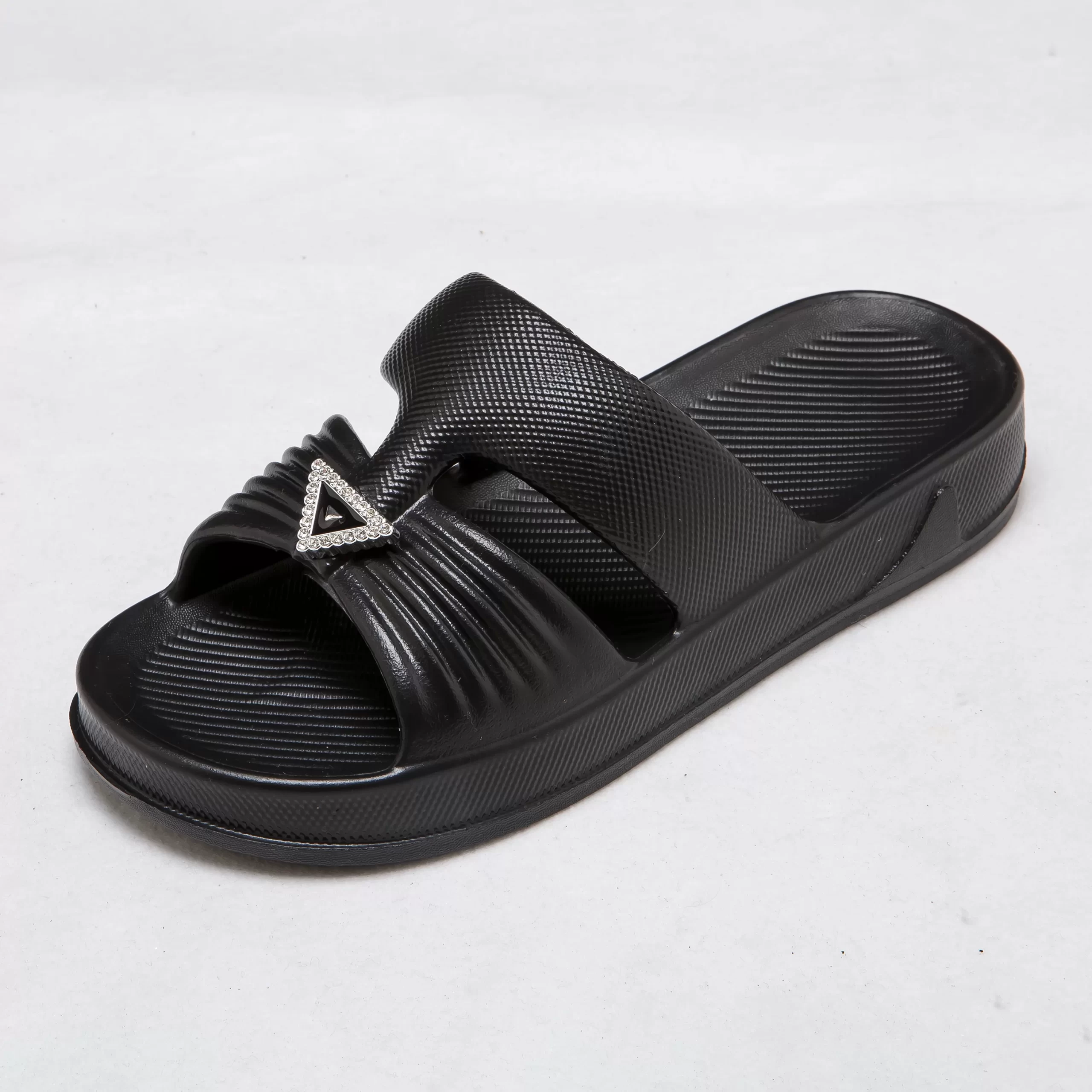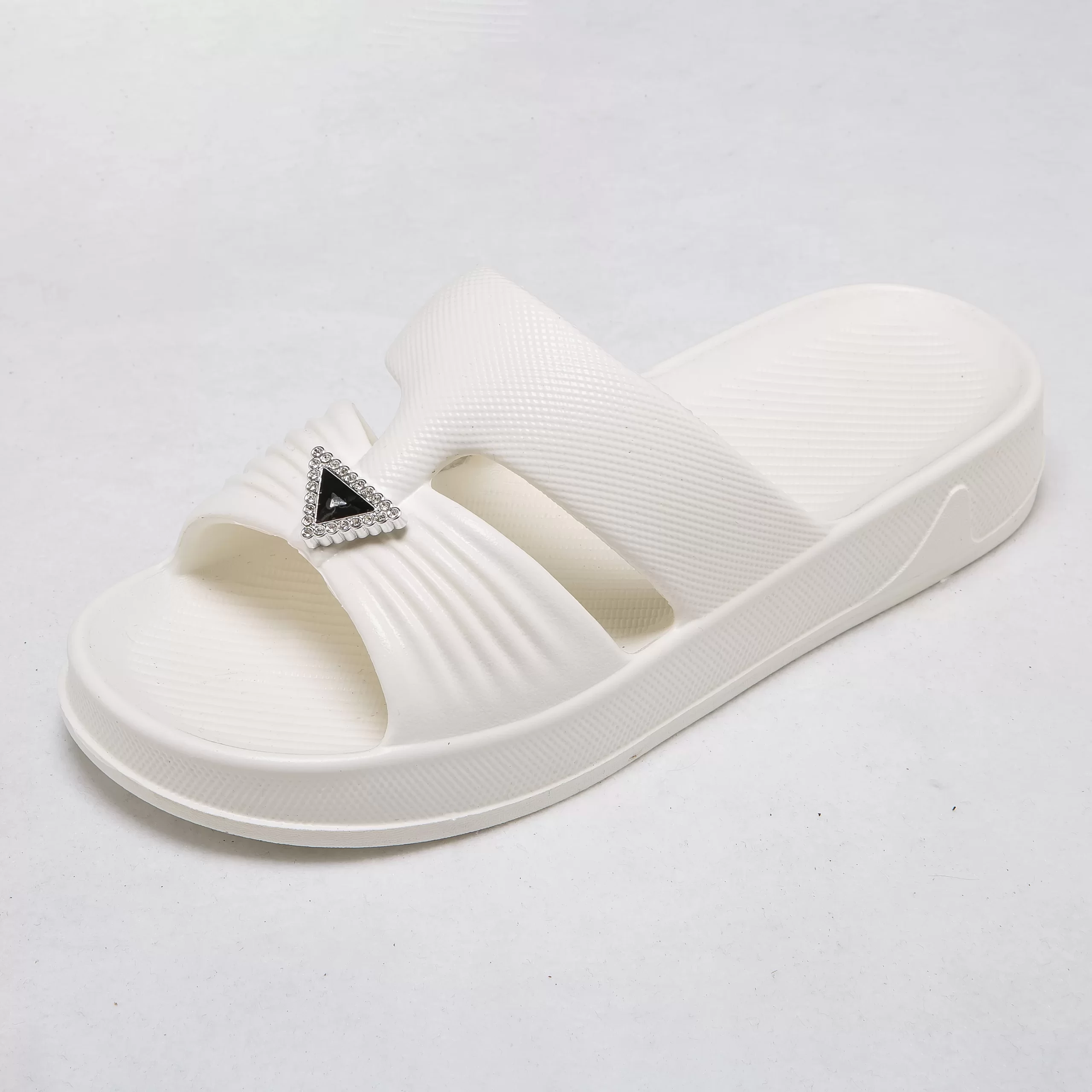 These elegant platform slides blend subtle glamour with everyday comfort, making them a versatile choice for your warm-weather wardrobe. The wide, ribbed strap features a sparkling triangular embellishment that adds a touch of sophistication, while the chunky EVA sole provides gentle cushioning and a subtle height boost.