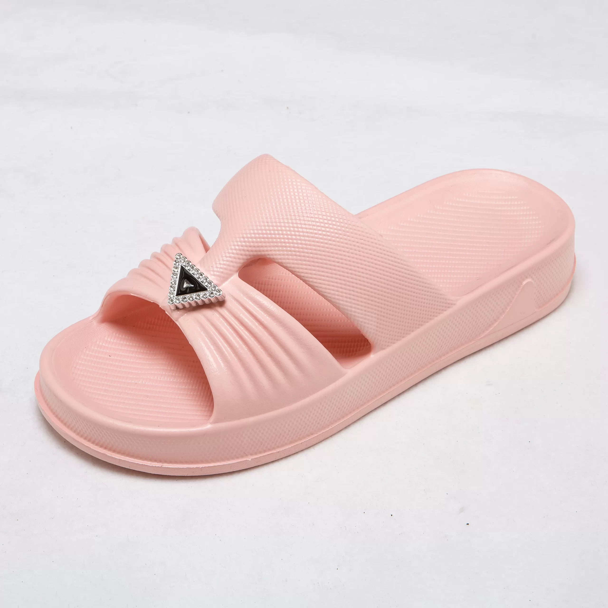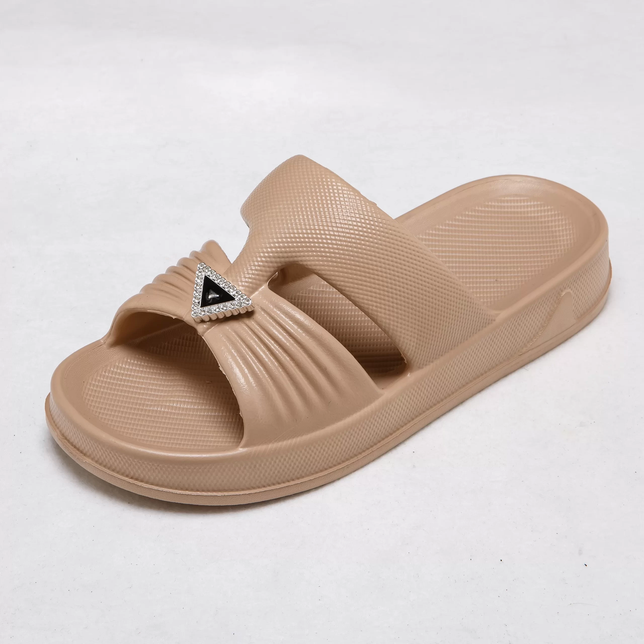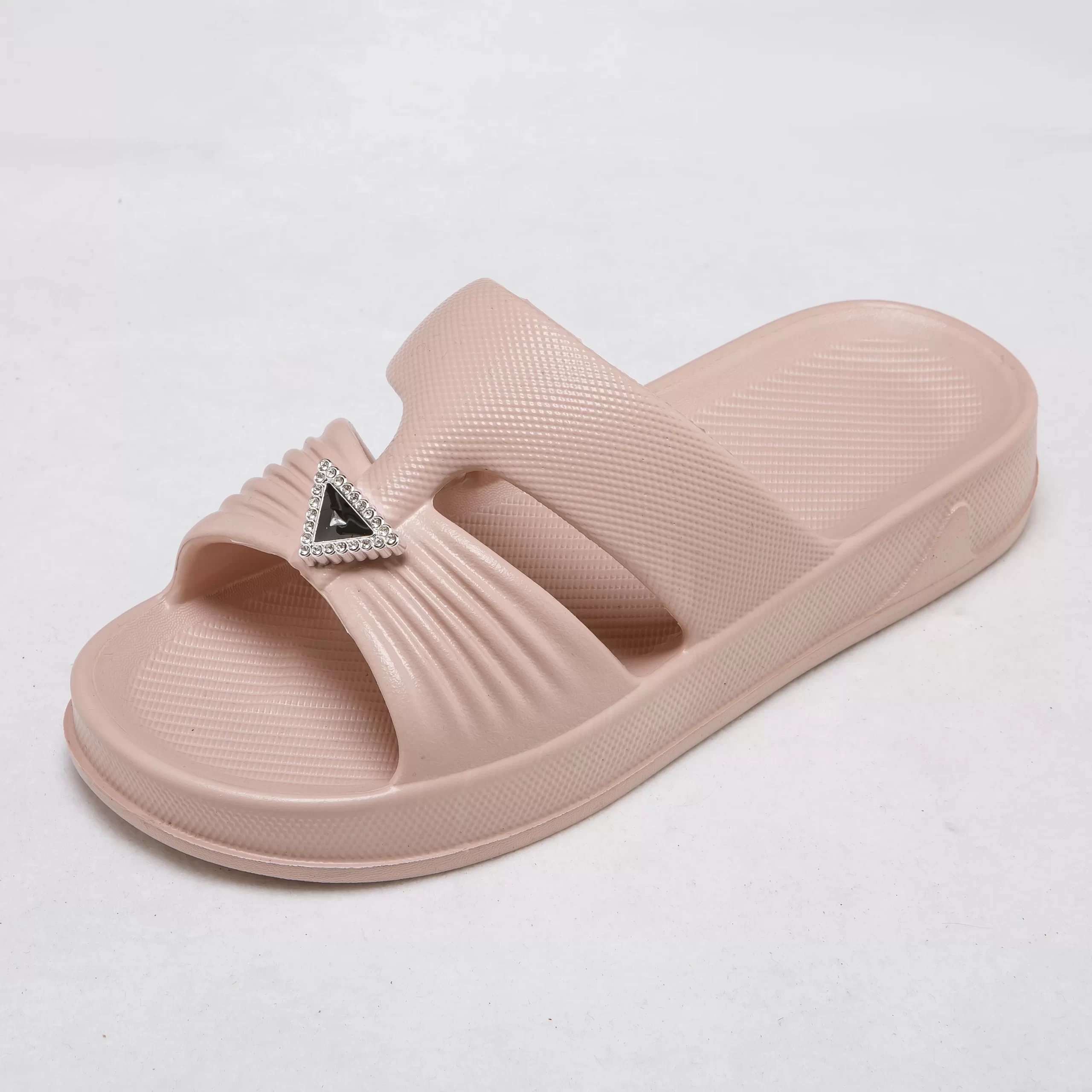 These elegant platform slides blend subtle glamour with everyday comfort, making them a versatile choice for your warm-weather wardrobe. The wide, ribbed strap features a sparkling triangular embellishment that adds a touch of sophistication, while the chunky EVA sole provides gentle cushioning and a subtle height boost.