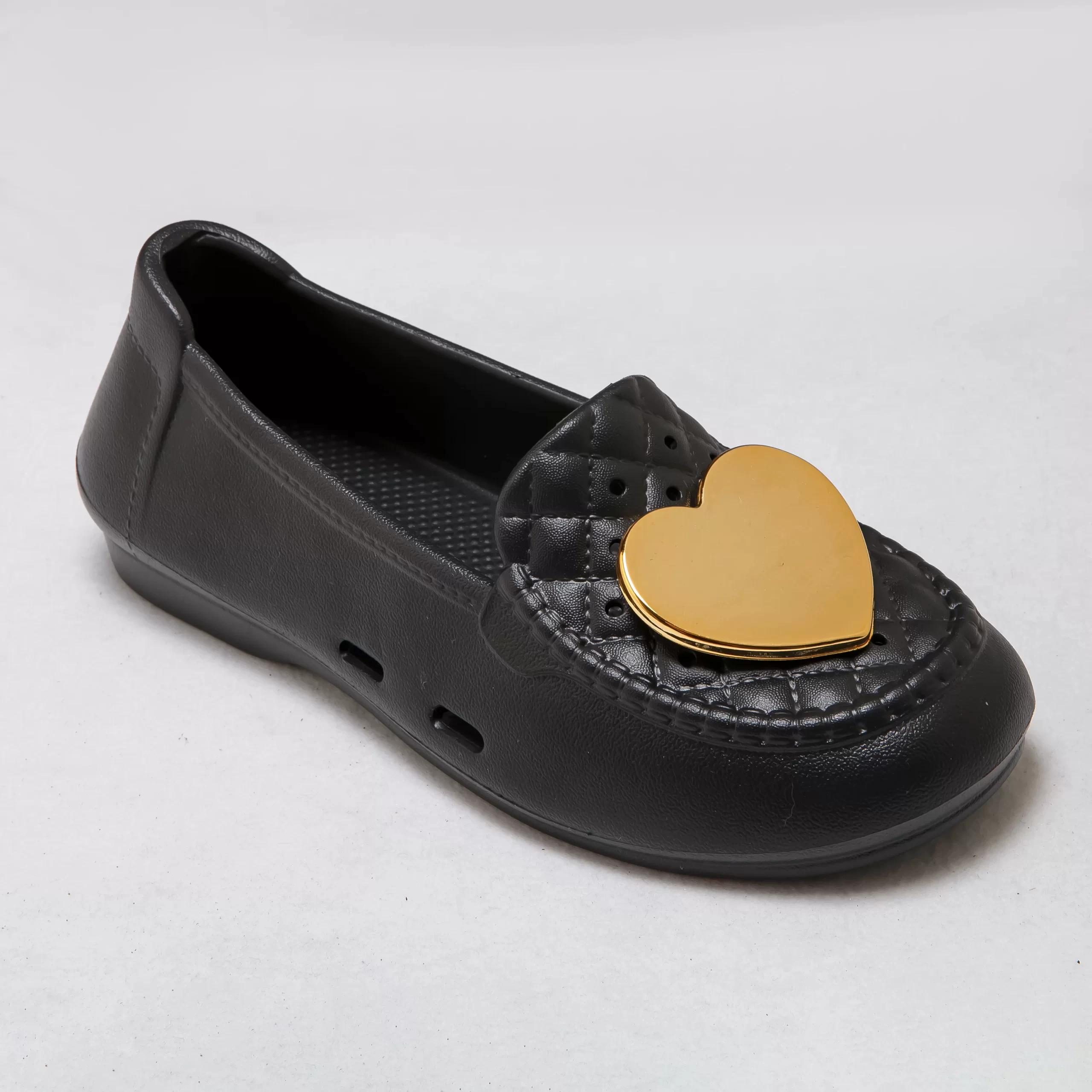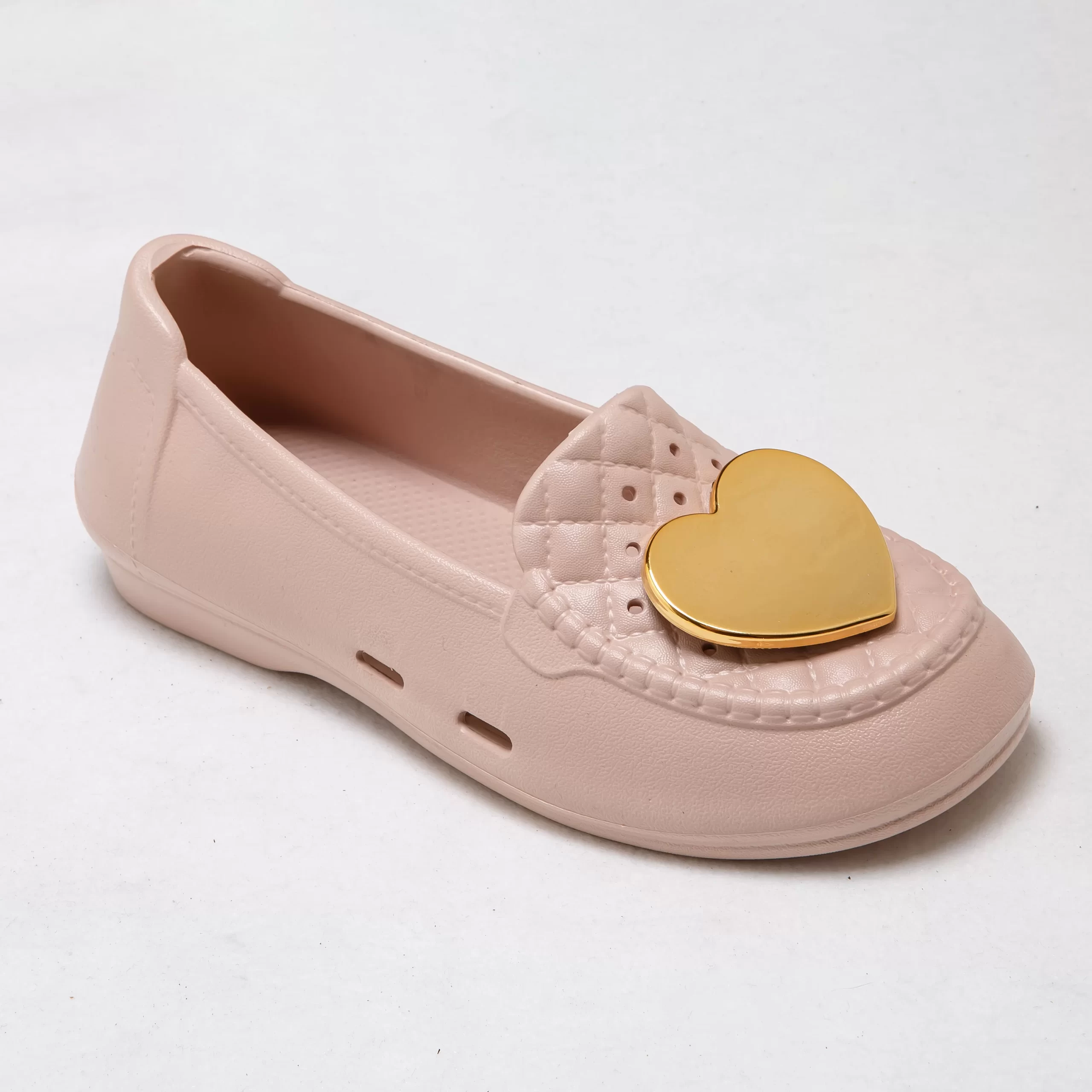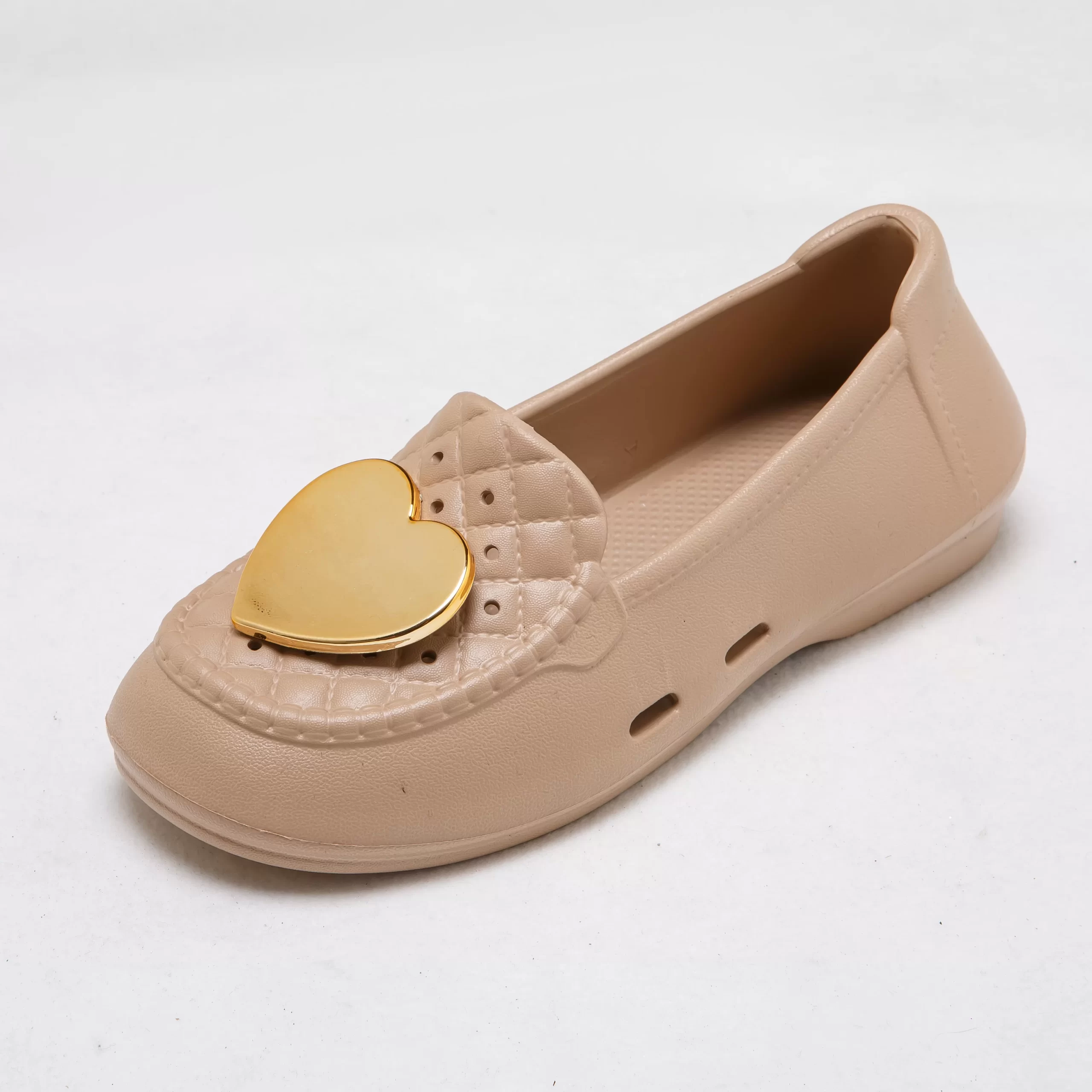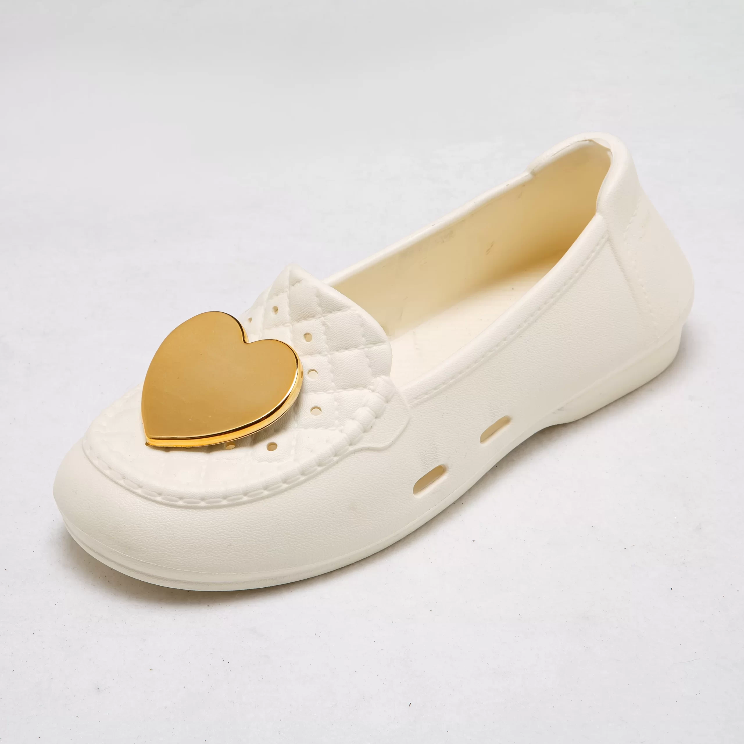 These charming slip-on loafers blend feminine style with everyday practicality, making them a versatile choice for warm weather. The glossy gold heart accent on the quilted toe box adds a playful, romantic touch, while the soft, flexible EVA upper ensures a comfortable, secure fit that won’t rub or irritate your feet.