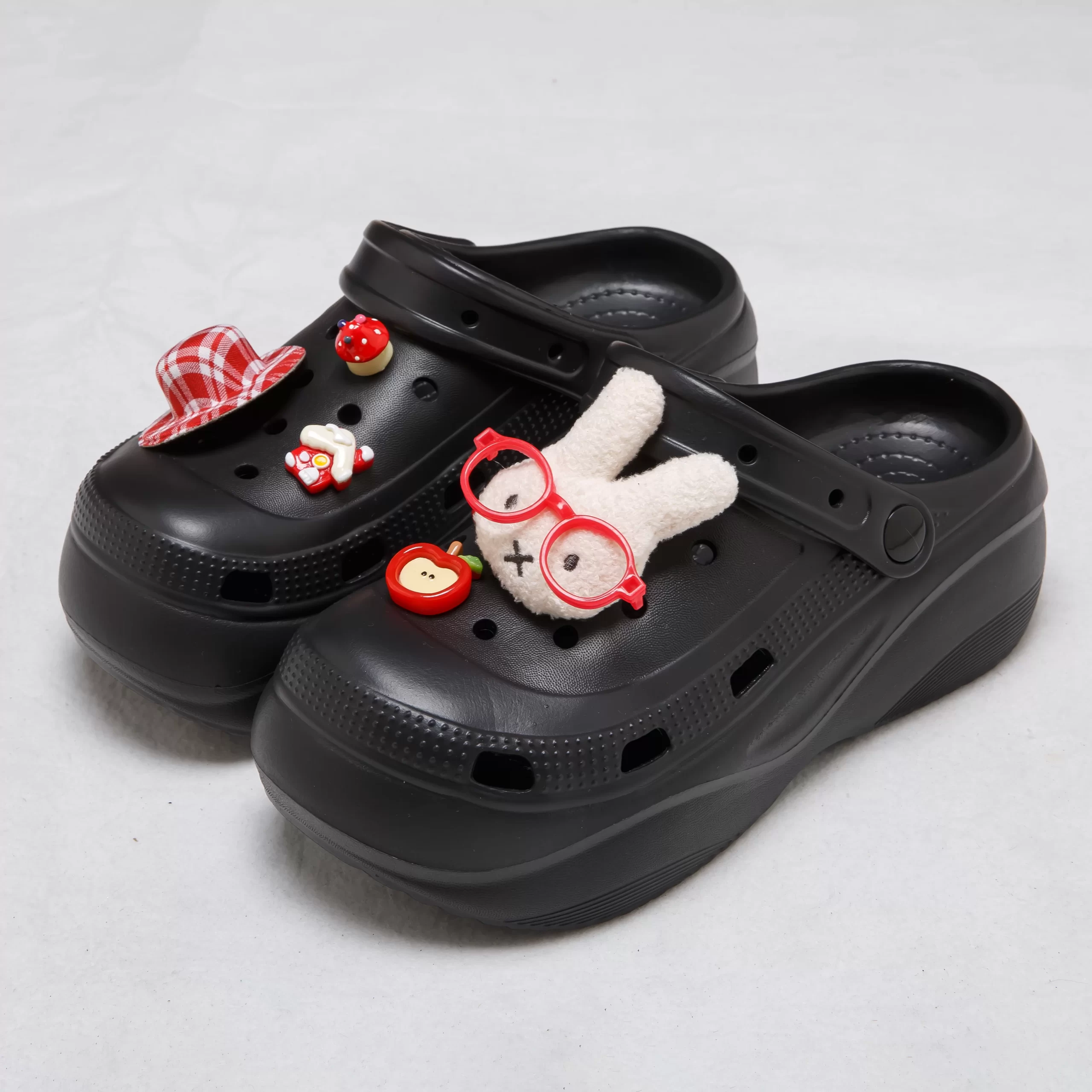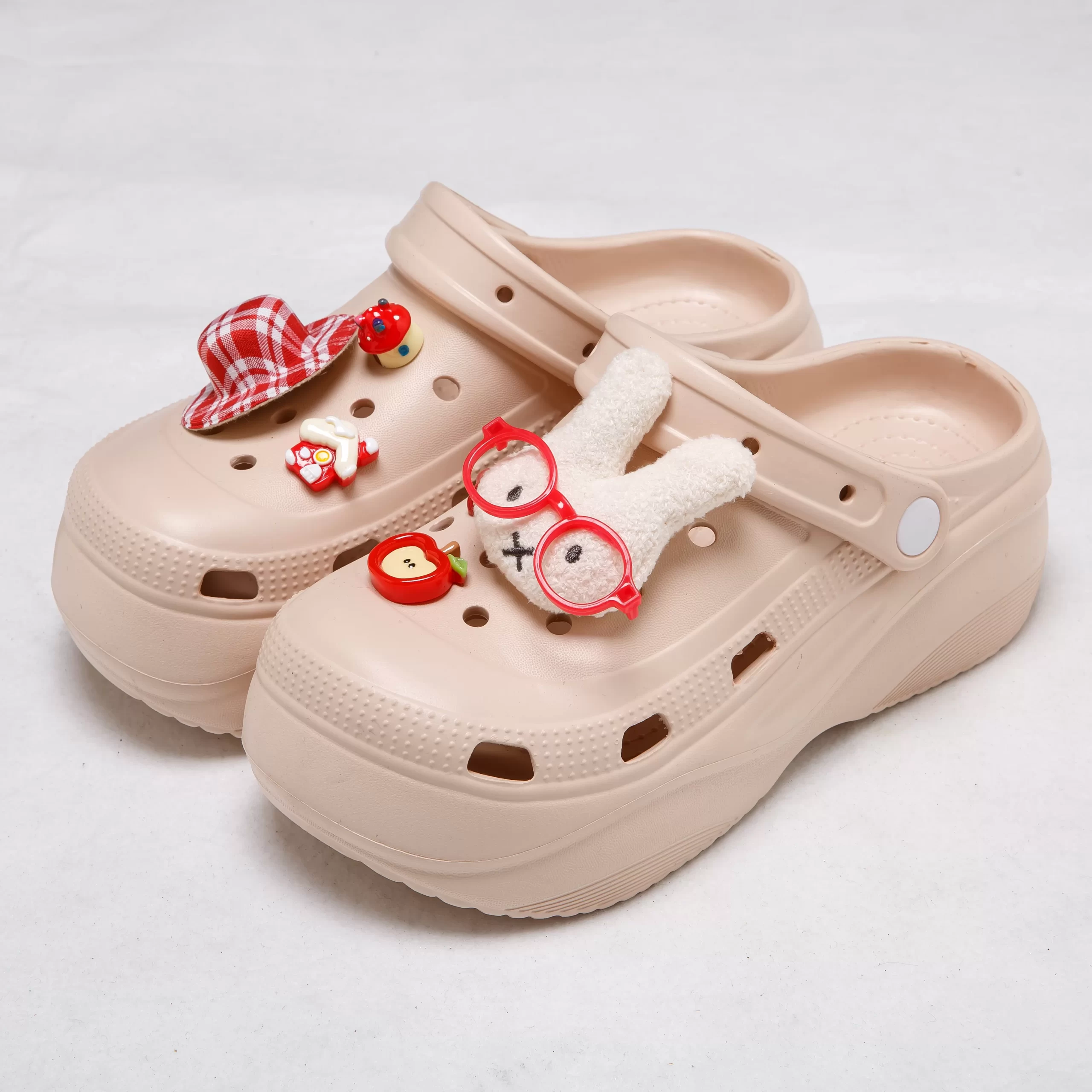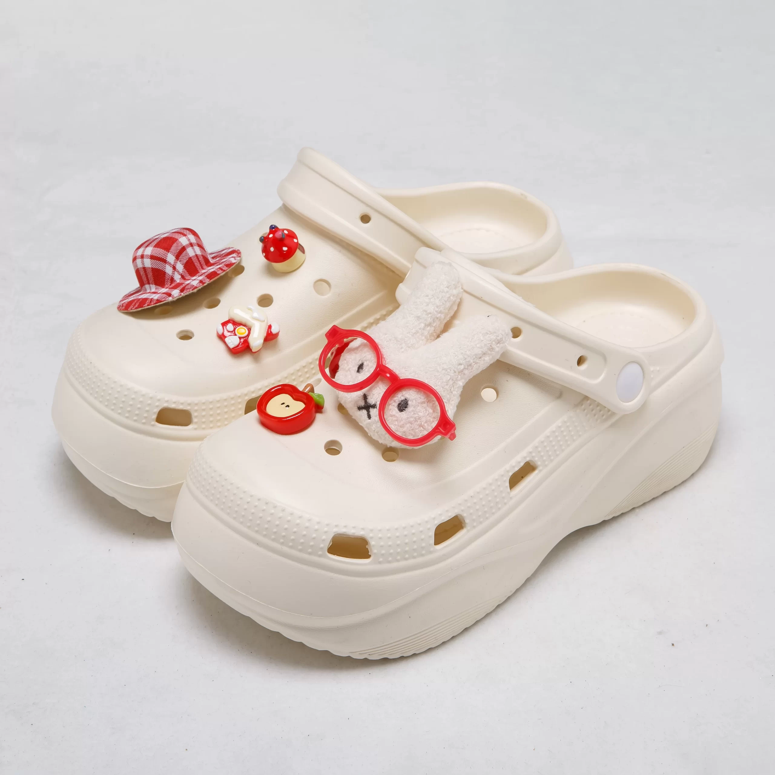 The shoe surface is adorned with removable, whimsical charms—including a fuzzy bunny with red glasses, a gingham hat, and a mini apple—letting you customize your look to match your mood. The perforated design ensures breathability, keeping your feet cool even on hot days, and the non-slip outsole offers reliable traction on wet or dry surfaces.