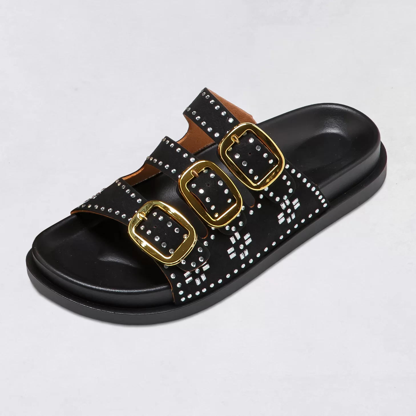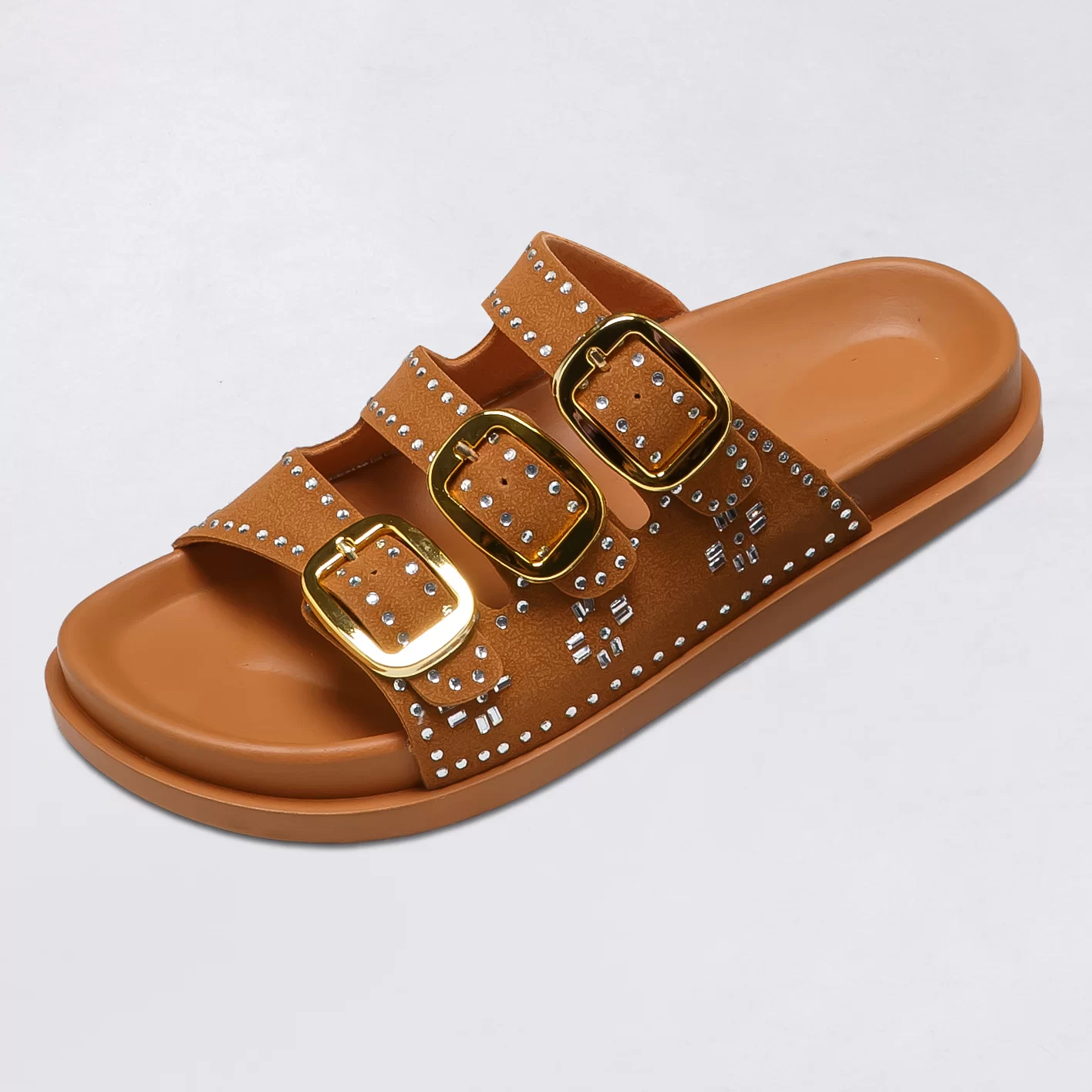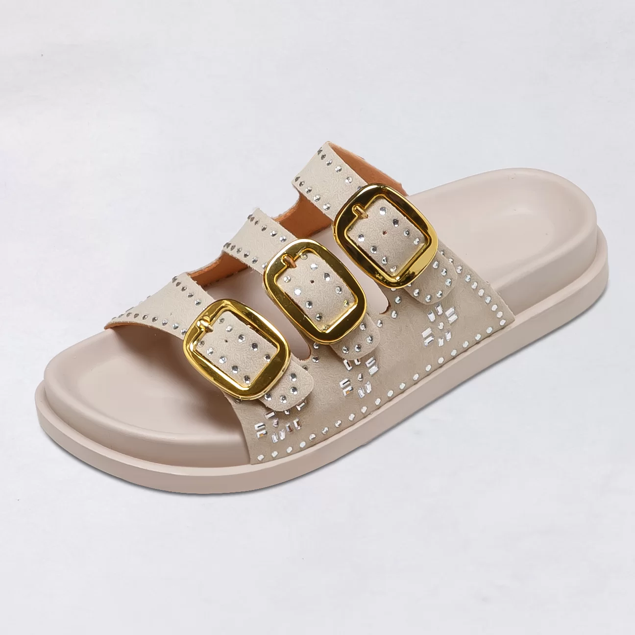 These bold flat slides make a statement with three wide straps, each adorned with metallic studs and a prominent gold-tone buckle, creating an edgy, glamorous look. The lightweight PVC construction ensures durability and flexibility, while the padded footbed provides all-day cushioning for comfortable wear.
